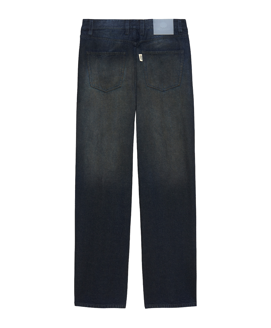 Denim trousers cut to a relaxed fit with a mid waist and straight leg. The garment is styled with a 5 pocket design and a dirt wash. Detailed with a branded metal button and New Amsterdam name embroidery on the coin pocket. Made from 100% cotton denim.