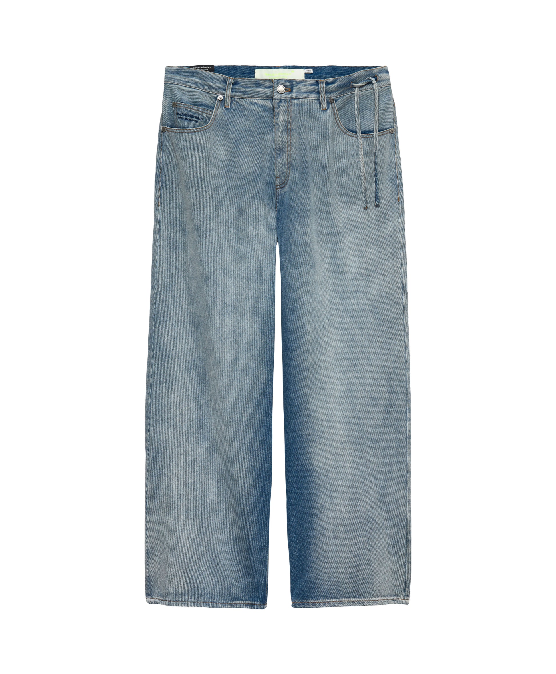 These denim trousers are cut to a oversized fit with a mid waist and wide leg. Detailed with a 5 pocket design, branded metal button, New Amsterdam name embroidery on the coint pocket. these pants feature adenim drawcords attached to the waistband for a adjustable waist. Made from 100% cotton denim.
