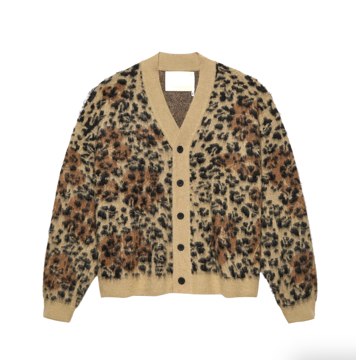 Oversized cardigan cut to a hip-length. This garment is detailed with an all over intarsia hibiscus pattern and a black Oyster logo on the back. Made out of a wool/acrylic blend for a soft hand feel.